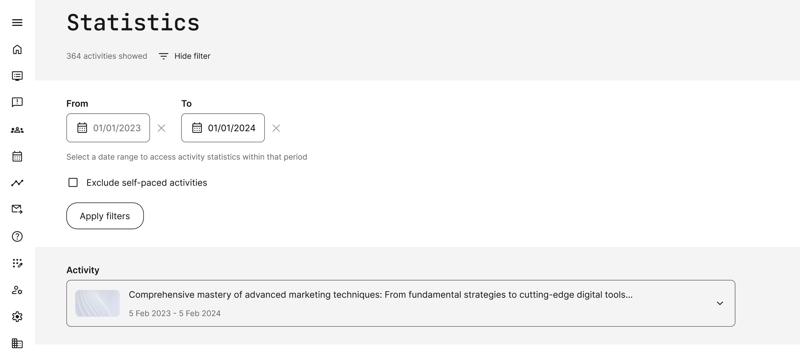 The image shows the "main menu → statistics" view with the filter selected on a date. Filters can include a specific module focus if it is a learning path.