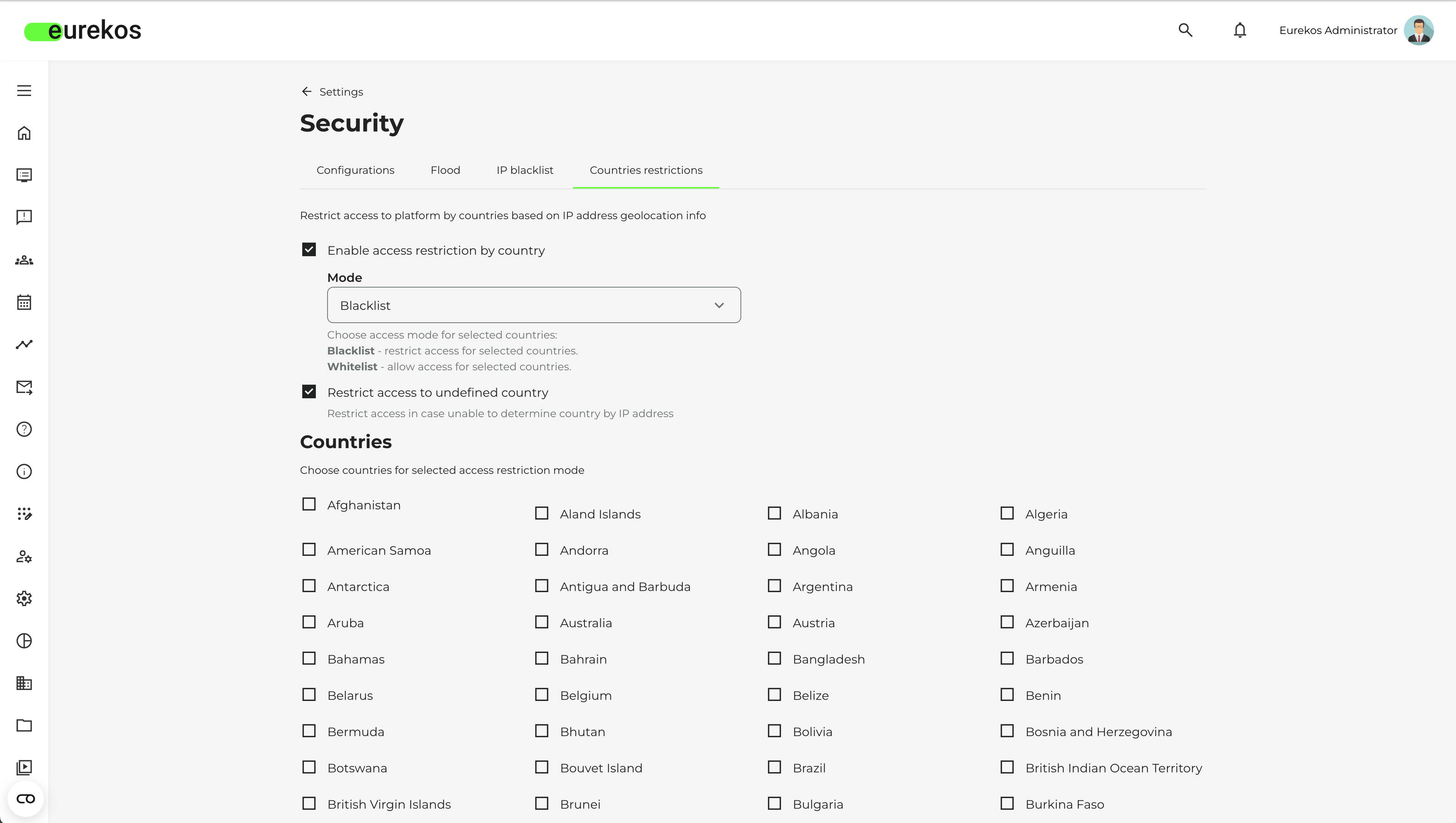 By default, both the blacklist and whitelist are disabled. The configurations will only take effect when you begin enabling countries in either mode and press save. Additionally, settings will not be saved if the administrator attempts to configure restrictions that would block their own access to the platform. An error message will be displayed in such cases, ensuring secure validation of access.